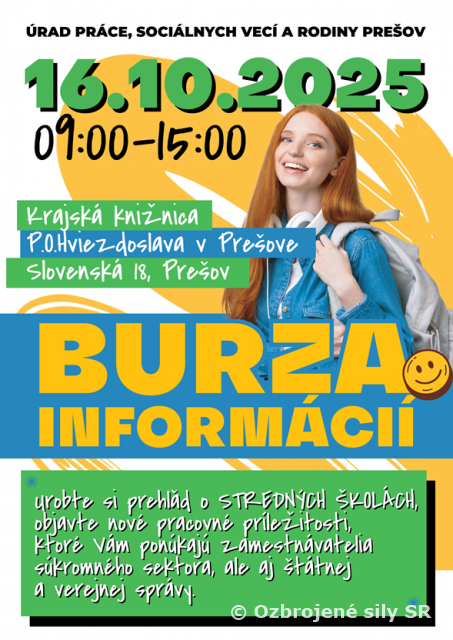 Burza informácií Prešov Už 16. októbra 2025 sa v Krajskej knižnici P. O. Hviezdoslava v Prešove uskutoční Burza informácií. Okrem zástupcov stredných škôl a zamestnávateľov sa na podujatí predstavia aj Ozbrojené sily Slovenskej republiky, Hasičský a záchranný zbor a Policajný zbor, ktorí priblížia svoju prácu a možnosti kariéry v týchto zložkách. Tešíme sa na Vašu účasť.